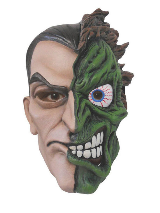 • There are two sides to everyone's story, wear the Two-Face Overhead Latex Mask and they will see. Two-Face started out as an upstanding citizen and a prominent attorney in Gotham. But he had a darker side to him which was exposed when half his face was destroyed. Now, you can recreate the look with this mask. It features fine detailing on both sides, with one portraying the clean cut Dent and the other depicts his gruesome disfigurement. Don't leave it up to chance, pick this mask for all your upcoming conventions and costume events.
