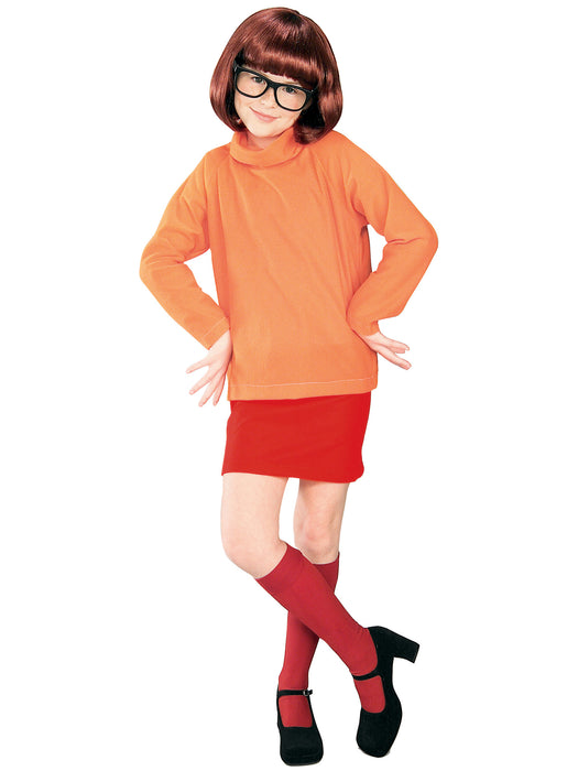 • You better start up the Mystery Machine--there's something weird going on around town! Wear your Velma Child's Costume this Halloween and you won't have to worry about any spooks. This set is a faithful recreation of her iconic outfit, starting with the shirt. The turtleneck top has long sleeves and falls to the hips to keep you warm and covered no matter where you roam off to. The bright red skirt has a flat form and falls to the mid-thigh, making it easy to climb through all sorts of haunted places. The included wig gives you Velma's famous red bob and straight bangs. A pair of thick-rimmed glasses comes with the set as well--put them on so you can see where you're going! Finish this Velma Child's Costume with a pair of black shoes and a magnifying glass, sold here.