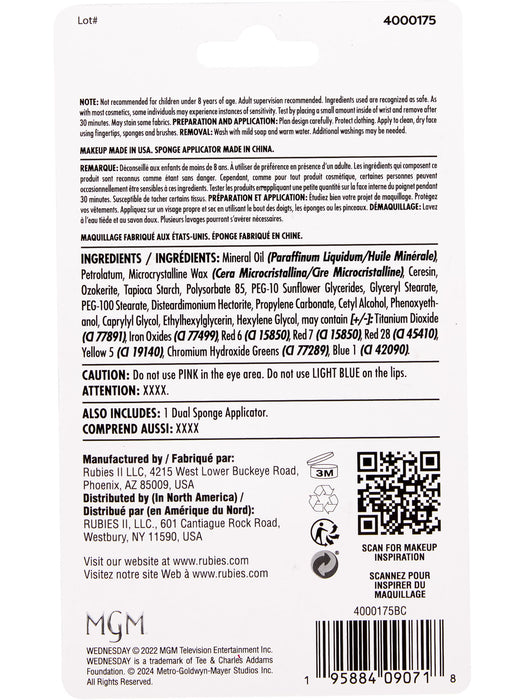 With this set, you will receive everything you need to get your makeup just right. Featuring a 4 color grease makeup kit with an applicator, ensuring your costume's makeup is perfect for your costume will be easy as pie this year. Pair this makeup with a matching Wednesday or Enid Sinclair costume from our site, and you're sure to be acing your classes at Nevermore Academy with ease. Pick up your makeup kit today, and go show the world just how fun school can be!