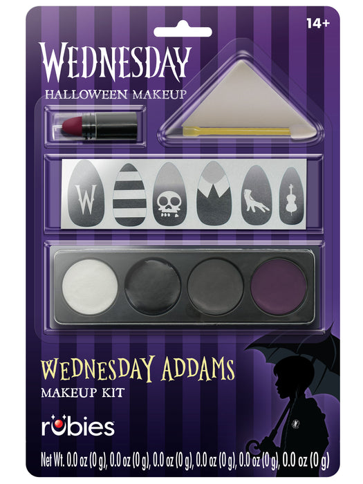 With this set, you will receive everything you need to have the most beautiful makeup at the party. Featuring a 4 color matte pressed powder palette, nail stickers, mini lipstick, a sponge, and an applicator, you'll have all the tools to make your dark gothic look come to life in a flash. With colors of white, black, gray, and a deep purple maroon, you'll certainly be pleased. Pick up your makeup kit today, and then check out our site for the rest of your Wednesday Addams and Nevermore Academy costume and accessory needs!