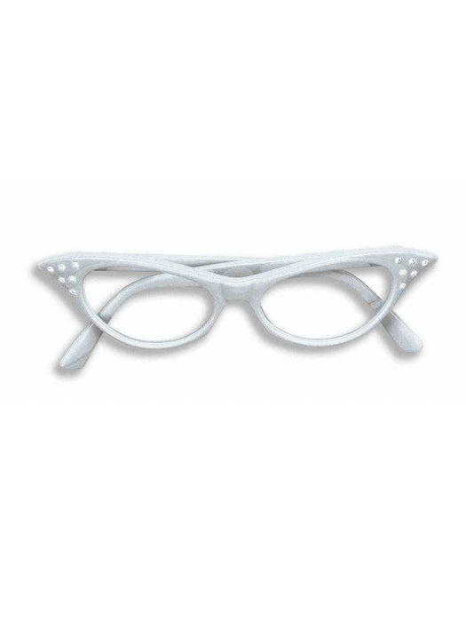 • The White 50s Glasses are the perfect supplement to your 50s inspired costume this Halloween! The white glasses are pointed at the top of the eyes and are garnished with silver studs. The frames do not contain any lenses.