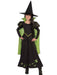 • Where's Dorothy? You have a serious bone to pick with her! Put on a Girls' Wizard of Oz Wicked Witch Costume and go find where that little brat went. This three-piece set is sewn from a lightweight polyester fabric that will sweep around you as you terrorize Oz. The long dress has wide bell sleeves and a short overskirt made of green and black fabric. Your knee-length attached cape has a short collar and warm green lining to keep you warm in that drafty castle of yours. The hems of the dress and cape are shredded into flame-like shapes for a creepy touch. The tall witch's hat has a trailing green train, helping you look as fashionable as you are frightful. Add on green face paint and a broom (sold here) to your Wicked Witch Child Costume and you'll be ready to unleash the flying monkeys!