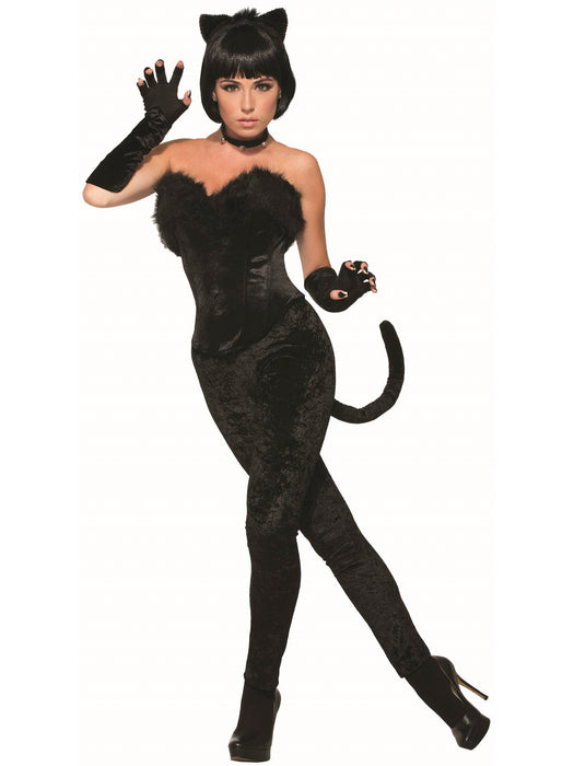 • Indulge your wild side with our Womens Black Cat Corset! Made from velvety black fabric, this corset will hug your curves and give you a fierce, feline silhouette. Perfect for Halloween or a daring night out, this corset will make you feel confident and alluring.