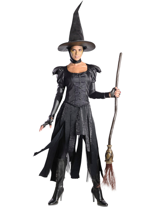 • Your legend lives on and now you can be the scariest witch on Halloween when wearing the Womens Deluxe Wicked Witch of the West Costume. This costume comes with a black dress that is both contemporary and classic. The order features faux leather sleeves with pointed shoulders, buttons down the front of the top, and tattered strips that make up the skirt. The final piece of the costume is an attached choker and hat combo that makes your face the center of attention. The hat is pointed at the top and hooked in order to give you a sinister look. This costume will certainly make you one of the most impressive partygoers around this year, but visit the accessories page and find some green makeup to wear on your face for a more horrifying look this Halloween.