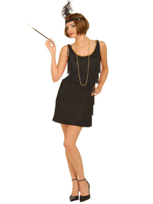 It's time to let loose and celebrate being a woman! This roaring 20s Flapper Costume is fun and flirty at the same time. Depicting the Gilded Age of society, this tank-style dress with allover fringe and golden sequin trim around the neckline is made for dancing. The coordinating sequin and feather headband accentuates the new bob hairdo style that most women of that period sported. Feel free to accessorize with long beads or other flashy costume jewelry?the more you get noticed, the better, right? A good pair of dancing shoes is definitely in order as well. Try dancing the Swing, the Charleston and the Jitterbug. You'll captivate each time you move in this swingy little number. Wear this liberating costume to any Halloween shindig or 20s themed party and announce your independence as a free-spirited, intelligent woman. The number one important thing though is to have a good time!