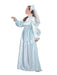 Romeo is sure to be enamored of you when you appear on your balcony in this Women's Juliet Costume. Inspired by Shakespeare's tragedy of star crossed lovers, Romeo & Juliet, this ensemble includes a long blue gown and a coordinating veiled headpiece. The icy blue gown features a white lace yolk and high collar. The split sleeves reveal a sheer white underlayer, and an empire waist helps create a demure yet beautiful silhouette. The matching hat is trimmed in silver with a white veil attached in the back for an authentic look consistent with fashions of the 16th century. While this outfit is an obvious choice for any production of Shakespeare's play, it's also a great option for Halloween. Even if you've already found your Romeo, you're sure to attract a few new suitors when you look gorgeous and graceful in this Juliet Costume for Women.