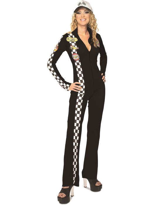 • Experience the thrill of the race in our Women's Black Racer Costume. This sleek jumpsuit features checkered flag detailing and comes with a stylish black and white hat. Perfect for any racing enthusiast, this costume will have you looking and feeling like a champion!