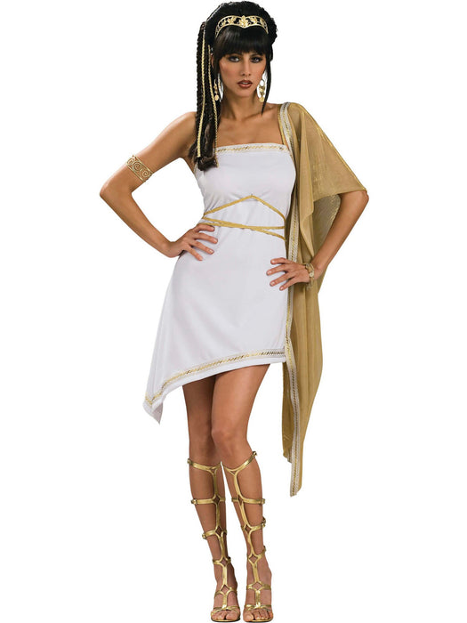 • Channel your inner goddess with our Women's Sexy Grecian Goddess Costume! This stunning ensemble features a white dress with intricate gold detailing, a gold cord to cinch your waist, and a flowing gold scarf for added drama. The perfect costume for any party or event!