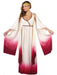 • Baby, you've got it, especially when you are wearing the Womens Venus Goddess of Love Costume. This stunning gown and headpiece are available in small/medium and medium/large. The white floor length gown is dip dyed at the ends in burgundy. It features a sexy low cut scoop neckline and burgundy trim on the bust and empire waist. Sleeveless, it has a split cape attached to shoulder straps by gold hoops. Venus is the Roman goddess of love and beauty. Myths say that she was born from sea foam. According to Virgil's Aeneid, Venus was the mother of Rome through her son Aeneas who fled Troy after its fall and landed in Italy. Enter the party wearing this outfit and you will rule all the mortals there.