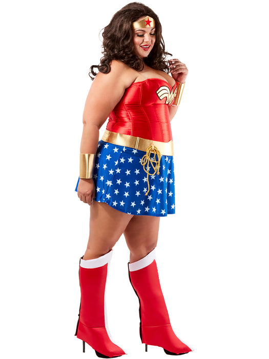 • The world of men is at war and there is one woman who can save it. Put on the Wonder Woman Deluxe Plus Size Costume for Adults and be that woman. Made just for the curvy woman, this outfit gives you a great fit so you can look great and feel comfortable while battling supervillains.